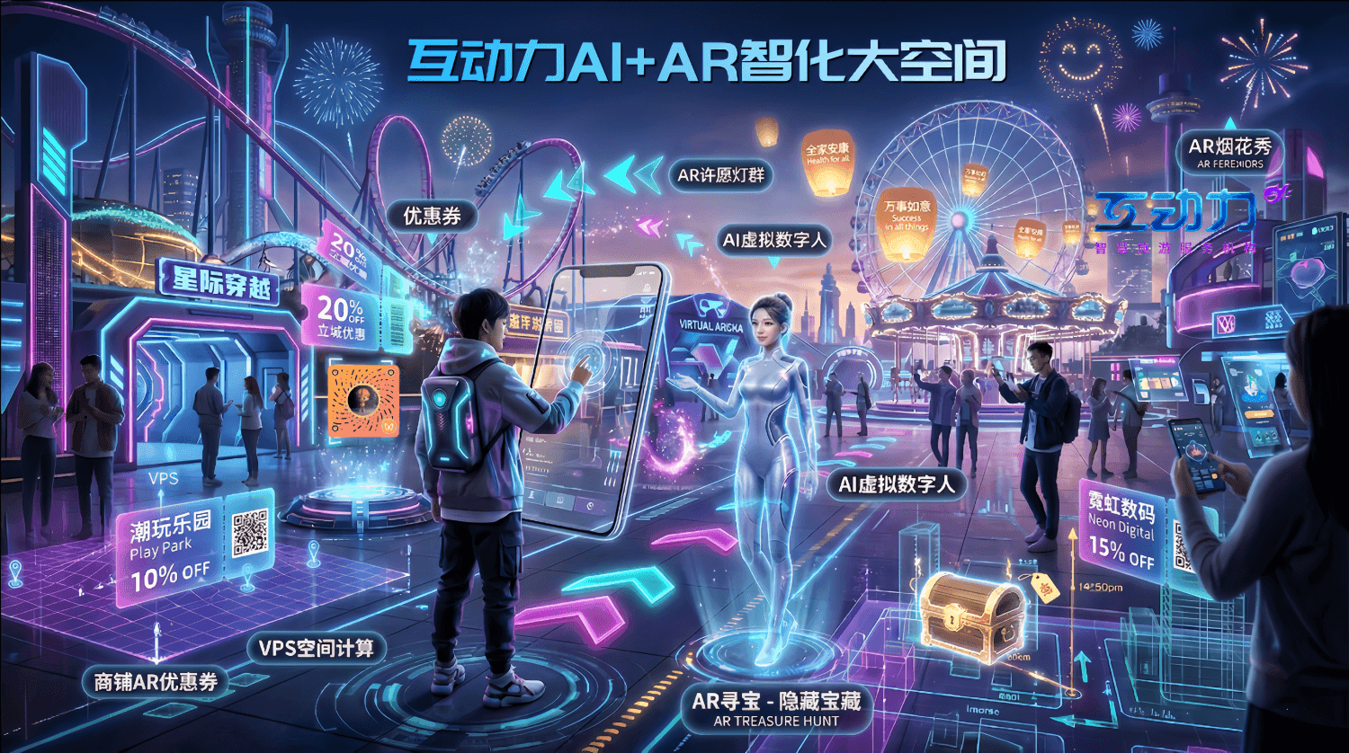 互动力AI+AR智化大空间是面向文旅行业的空间级数字宾客系统,通过厘米级空间定位、AI游客行为分析与AR可视化交互,打通导览、导购、导游、导航与营销全链路,助力景区从“服务游客”升级为“运营用户”,实现体验与收入双增长。 其核心技术为“脑、眼、锚”协同架构:iPOW AI智算大脑可整合景区资源、智能分析游客行为并生成个性化推荐,iPOW AR视见以超写实渲染实现技术与文化细节的视觉呈现,VPS大空间视觉厘米级定位则实现室内外精准空间锚定,为沉浸式体验奠定基础。 产品打造导览、导购、导游、导航、营销五位一体功能模块, 智化导航实现AR实景精准指路与智能人流调度,智化导览让游客深度参与文化剧情、激活静态景观价值,智化导游提供一人一线定制化游玩路线并降低人工成本,智化导购将消费剧情化、实现景区二销高转化,智化营销活动则支持云端快速部署主题、低成本高频造节,通过沉浸式RPG活动提升景区吸引力,真正实现“体验即消费”。