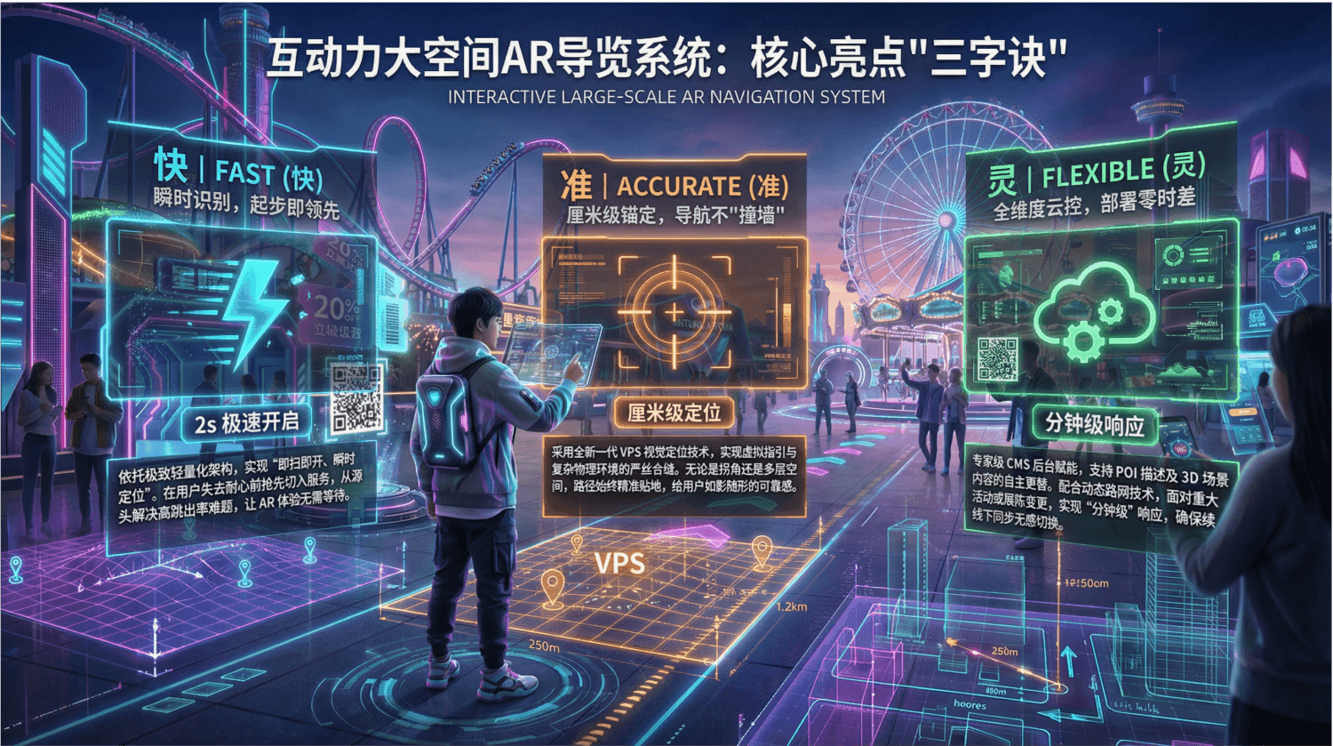 面向大型室内及室外空间(购物中心、主题景区、会议中心展馆)的增强现实(AR)导览解决方案。通过智能手机摄像头,为用户提供虚实结合的交互式环境,实现精准目的地导览、信息获取和商业推广,提升用户体验与运营方的商业价值。